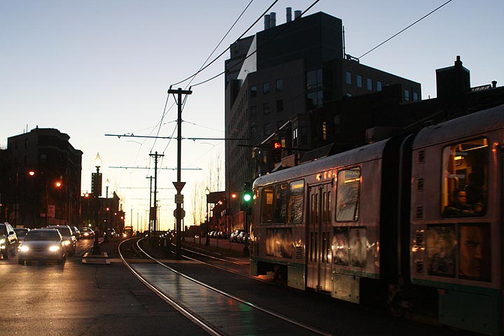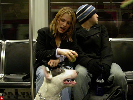 the subway ride back to porter square was a bit surreal. first, i was squeezed between two women, one reading karl marx (so cambridge), the other an attractive gigantess browsing an issue of newsweek. a man came onboard tugging a pit bull on a barbed leash. there was an uneasy rustle as people eyed the dog with some apprehension. the dog seemed friendly enough, whipping people with its tail, but seemed a bit hyper. a woman came onboard, a rather busty female wearing a distracting v-neck sweater, and apparently she knew the man because she started playing with his dog. the pit bull was chewing on a wet tennis ball that would occasionally drop out of its mouth and it'd chase after it, plowing through people in the process. when the couple finally sat down opposite me, i knew i had to take a photo otherwise i would kick myself forever.