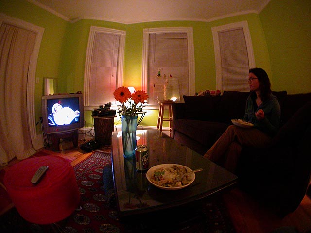 i used tofu instead of chicken since jesse's a vegetarian, and only half a can of curry paste instead of the entire can because jesse preferred the mild over the hot. we finally ate by 9pm, watching the latest episode of beauty and the geek. jesse ate everything but the eggplants, somebody with even less affinity than i do for those slimy purple vegetables. before she left we played a few rounds of i love katamari.