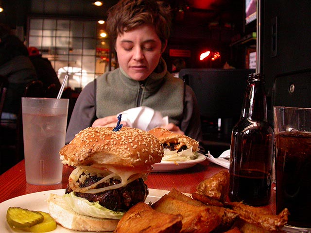 we decided to get something to eat. we tried the papa gino's in the meadow glen mall but it was no longer there. next, a pizza place on boston avenue was closed as well. ball square failed to offer any good eating places too. in the end, we came back to my neck of the woods, and went to o'sullivan's for some burgers. i got the garlic burger, which i thought would have garlic rolled up in the patty but it just had a spread of crushed garlic (it was still a good burger, but my favorite is still the black and blue - crushed pepper with blue cheese).