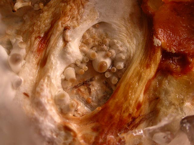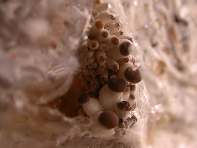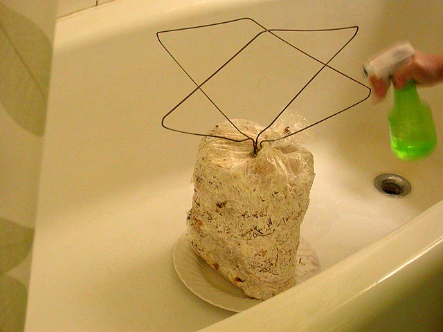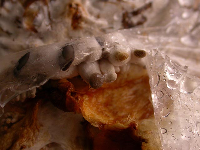 okay, remember that nasty boil i was telling you about last week? how it sort of ruptured and got really infected and i was afraid to go see the doctor because i don't have the best health insurance? well... ha ha! just kidding! that's just a really disgusting mushroom photo. i've neglected them for a few days, figuring nothing else would grow, but guess what? more are sprouting out! from new places and old ones as well. i moved the bag into the tub and gave the whole thing a nice misting of rain water. i'll be curious to see how these new batches of mushrooms will grow, out of the plastic case, back to the humidity tent.