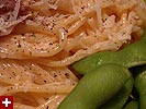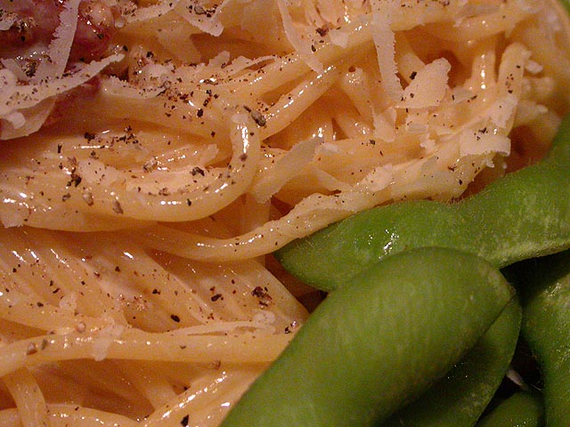 for dinner i made spaghetti carbonara with a side of edumame. i was watching everyday italian earlier (despite the fact that i was badmouthing giada yesterday),