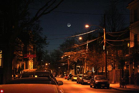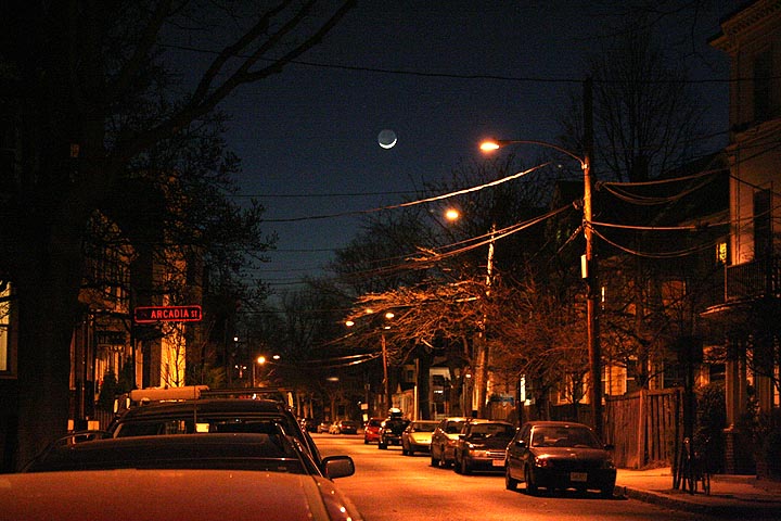 in the evening both julie and my sister called me to look at tonight's moon, a thin crescent hanging in the sky. i went outside and took a few photos, drawing the suspicion of my neighbors. speaking of which, i received a flyer in the mail today about an initiative to form a neighborhood watch. oh my god! that's like my idea! unfortunately i won't be able to make the meeting, but i will be sure to let whoever-in-charge know that i want to be the sheriff and will look online tonight to find a place where i can purchase a taser and a pair of nunchucks.