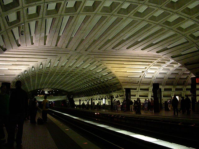 washington DC has a few airports. the only bad thing about jetblue is it goes to dulles international, which is 22 miles outside of DC. to get into the city i needed to take a $9 private shuttle bus. i managed to catch the 10:30am shuttle, about a 30 minute ride. the shuttle only drops you off at the east falls church station on the metro orange line on the outskirts of the city. to get into the city itself involves another 30 minute train ride. i called amanda when i got off the bus and she told me to meet her at dupont circle. this gave me a chance to ride the famous washington metro for the very first time. i wasn't impressed until i arrived at metro center to take the red line north: the place looked like an underground cathedral. once i met amanda at dupont circle, we took a bus back to her place in mt.pleasant north of adams morgan.