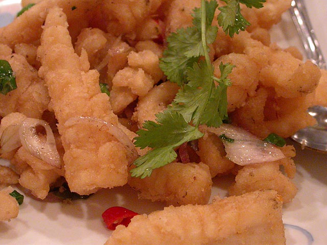 a plate of pork intestines, and a serving of spicy fried calamari. in the end it was just too much food for me and it wasn't even that good. i ate half the intestines and most of the calamari - the final bill came out to be $25 including tip. i didn't bother taking any of it home (nobody back at the house would eat it anyway, even if they weren't all vegetarians).