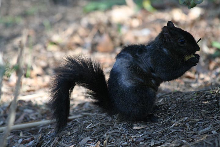 on my way to the birdhouse i saw another black squirrel digging in the dirt to find some buried nut. this squirrel looked weird, like it had white spots, almost like a skunk. it was only later i realized the white areas were actually bare batches of fur from possible mange. it's not like all DC squirrels are black because i did see some normal squirrels, but there's definitely a significant population of them with melanism. later i saw a third black squirrel, this time without the mange.