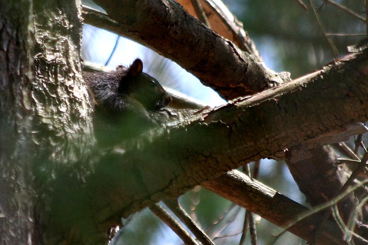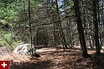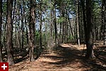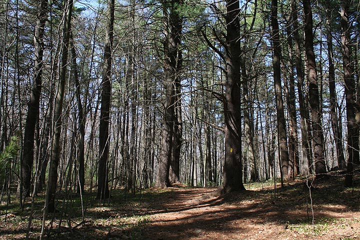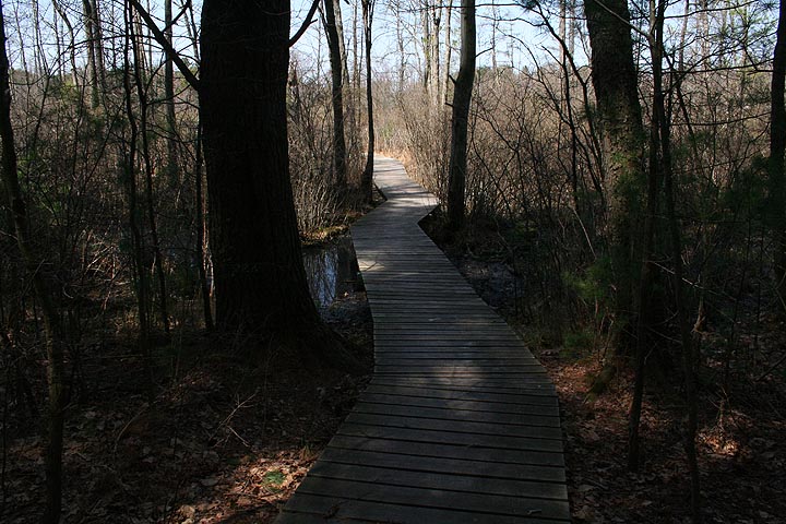 i visited all the ones nearby so i was excited to find a new one. i parked the bike in some shade and got prepared: put on my large backpack (which contained my rubber boots, in case i needed to go bog walking), got out my trail map, and slung the camera around my neck. overhead a small speck was gyrating in the air, i could tell right away it was a red-tailed hawk. as i started walking into the forest, i saw a black squirrel climbing a pine tree.
