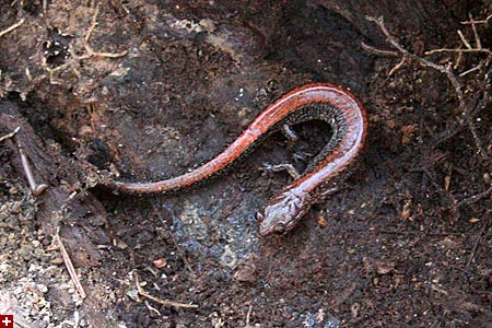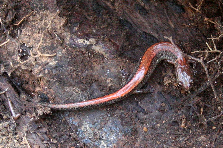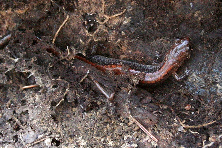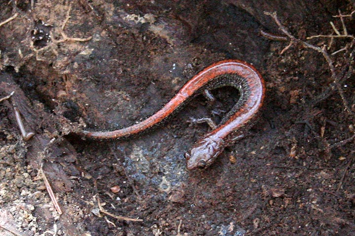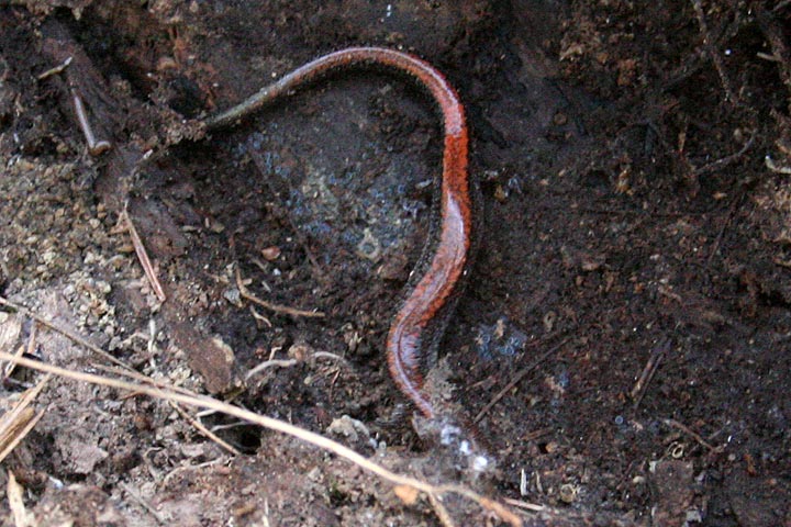 could this be a red-backed salamander? did i actually find one? i just stared at it for what felt like infinity, trying to see more. then it started moving and even though i couldn't see its head yet, i could definitely see its legs. earthworms don't have legs. and then it crawled completely out from under the leaf litter, this wormy-looking thing that was definitely a salamander, with a frog-like head and feet for crawling around (about 3" long). i was in an awkward position, still holding onto the log with my legs, yet somehow i managed to grab my camera and take a few snapshots. after a few minutes the salamander turned and crawled back underneath some leaves. i slowly lowered back the log.