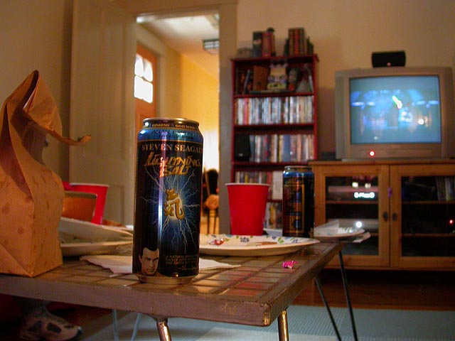 fire down below (1997): sounds like a porno but it's really a steven seagal vehicle with an environment-friendly message which coincided with earth day (today). dare i say it? probably the best movie of the night in terms of inadvertent comedy and audience participation/feedback, we also had the most number of people by then, somewhere around 10. elias provided us with the official steven seagal energy drink called "lightning bolt" (we had the blue asian experience flavor, made of all-natural ingredients like goji berries, cordyceps, and guarana).