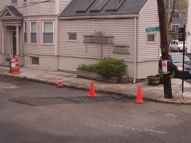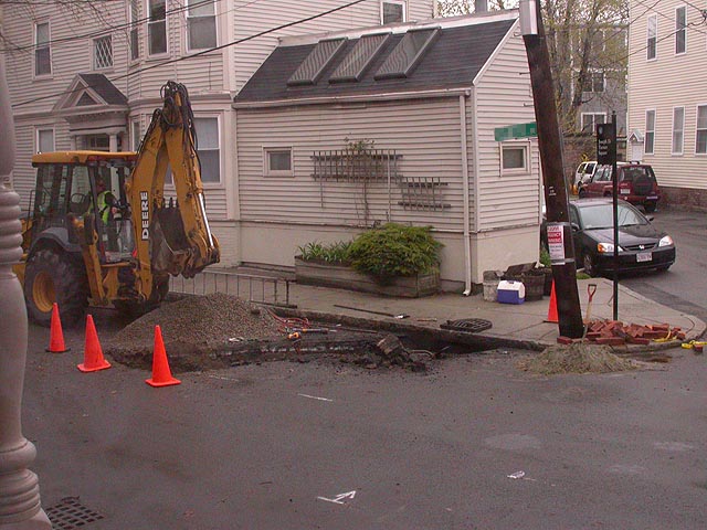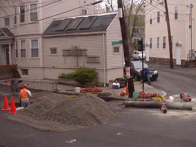 later in the morning i had a meeting with client N in allston-brighton. i was afraid it'd rain and thought maybe i'd have to take a bus but a check of the doppler radar revealed a temporary clearing so i risked it and rode the bike down there despite the slight drizzle. coming back, while waiting for the lights to change at an intersection, a couple of construction guys were giving me the business. "rebel! rebel!" one of them shouted from the ditch he was digging in the road, in reference to my motorcycle. his friend laughed, and said, "he's a nice guy this one, employee of the week!" there seems to be an unspoken brotherhood between bikers and construction workers. you ride a bike, you enter a secret world of blue-collared solidarity.