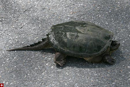 snapping turtles lead aquatic lives so the fact that this one was crawling around on land must meant it was just out laying some eggs; the mud covering the lower half of its shell is proof. there was also mysterious scratches on the carapace, i don't know whether they're from natural causes or from an animal.