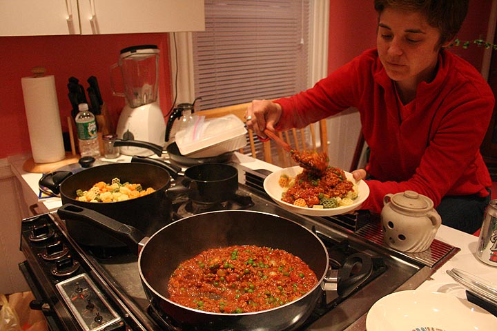 i made a simple meat sauce with fiori pasta for dinner just in time for the start of the red sox yankees game in new york (beckett versus randy johnson, unlike here it wasn't raining). for dessert julie had bought a carton of curse reversed ice cream while i got some special red sox edition hood ice cream sandwiches with a caramel center. the game didn't start well for the red sox with matsui giambi hitting a 2 run homer to take the lead, but after a-rod bobbled the ball, the red sox gained the momentum and scored several runs for each successive innings thereafter. even alex gonzalez managed to smack in a homerun and bench guys that normally wouldn't even get to bat were getting hits. it was a thrilling spank-a-thon but towards the end i started feeling bad for the yankees, it was downright embarrassing. these are our sworn enemies? maybe the toronto bluejays are more our equal. beating the yankees bring no great joy (some joy, yes, but not great joy) when the yankees seem to be sucking so much.