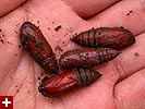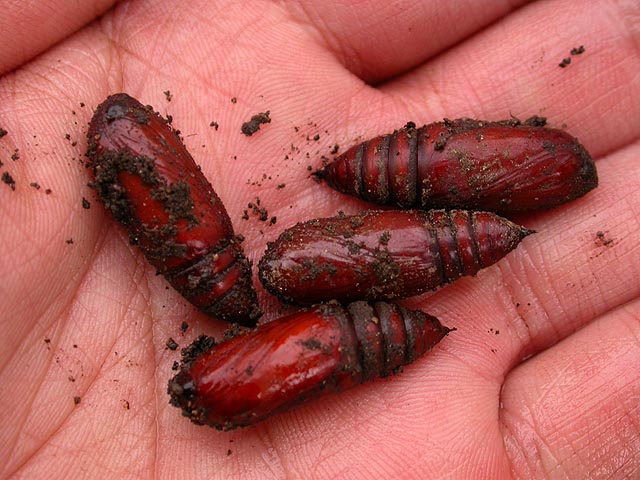 all that digging naturally brought up some critters. most common were the earthworms; whenever i could help it i'd relocate them to somewhere else so i wouldn't cut them in half with my digging tool. there was one worm in particular, a giant, and when i went to pick it up, it spewed this mucus slime all over my hand, i've never seen that before. there were also the green cutworms and the white japanese beetle grubs. for the most part i have a very non-violent attitude towards insects. i never kill spiders and when a fly enters the house i open a window to make it leave. however, when it comes to cutworms and beetle grubs, i am ruthless, placing them under my shoe and crushing them. i must've killed at least 2 dozen easily. i have no love for these garden pests. i also found moth pupae; they're probably bad (may be the near-adult stage of cutworms, not sure) but they seem too intricate and alien to destroy, so i just left them on a fence post and hope that maybe some birds will eat them.