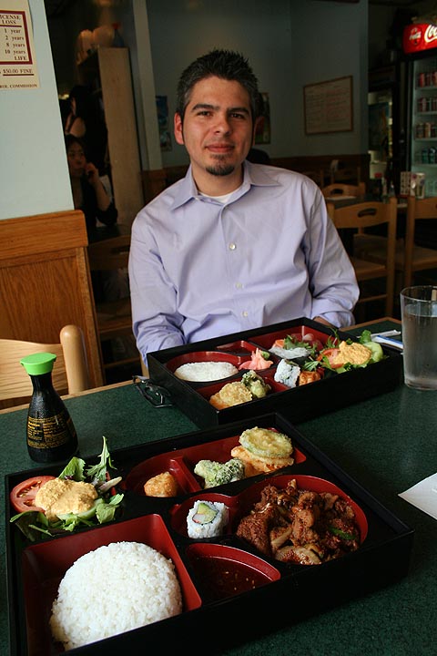 james and i went to suishiya for lunch instead. suishiya used to be one of my favorite places, until they raised the price on their box lunch specials at the same time skimping on the ingredients. they still have good sushi though, which is what i wanted, but after looking over the prices, i lost my yearning for raw fish and went with a lackluster box lunch special in its place. the last time i saw james was back in january. on this occasion, we were the first customers so we grabbed the window seat. james was all dressed up today, lack of clean clothes his excuse.
