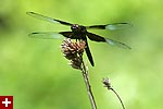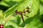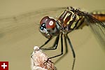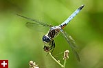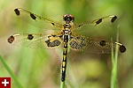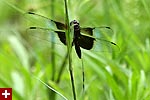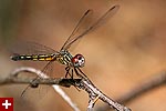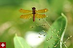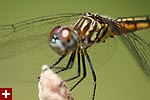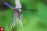 i got a lot of photos of blue dasher dragonflies. the males have a blue abdomen with a yellow thorax striped with black followed by green eyes. the females are just yellow with black striped and brown eyes. immature males also resemble females, but ones i saw were maturing to be adult males so they had brown eyes. although i didn't see it until i saw the photos, but one of the dragonflies had a few parasitic water mites on its body.