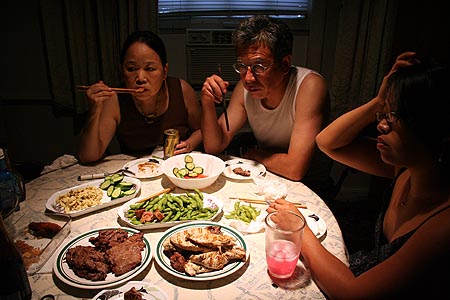 i woke up before ang tao for a change, at 9:30am. i thought he'd already left before i saw his shoes were still in the foyer. he didn't wake up until an hour later, ate some breakfast, then rode the bike to the research lab to work. as for me, i ate a salmon cream cheese bagel and spent the day moving as little as possible in a strategy to stay cool, watching some baseball and women's golf on television. my upper back still hurts from yesterday morning, when i slept on it wrong and now every twist of my torso brings shooting pain. in the evening i went to belmont to get a haircut from my mother and to have her hem a pair of traveling pants. we had barbecue for dinner, electing to eat inside with the newly installed air-conditioner.