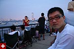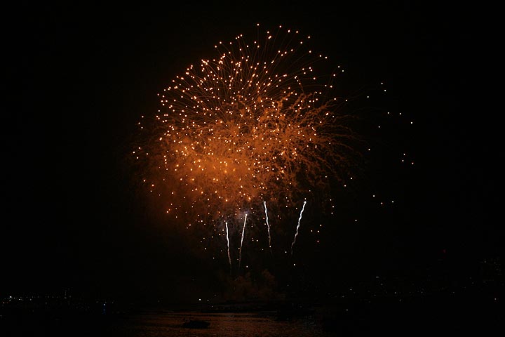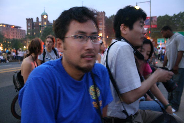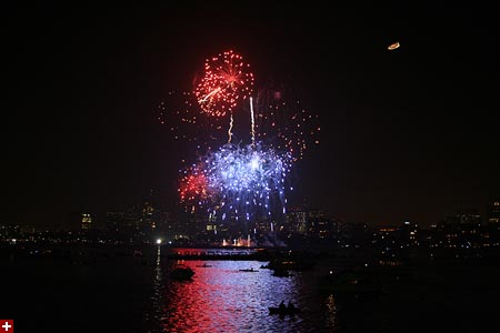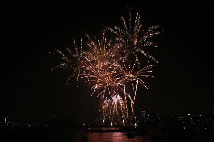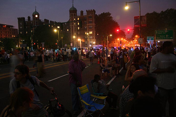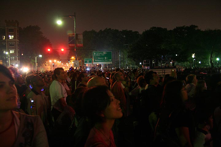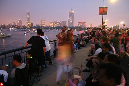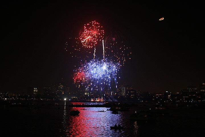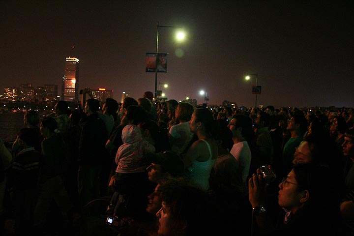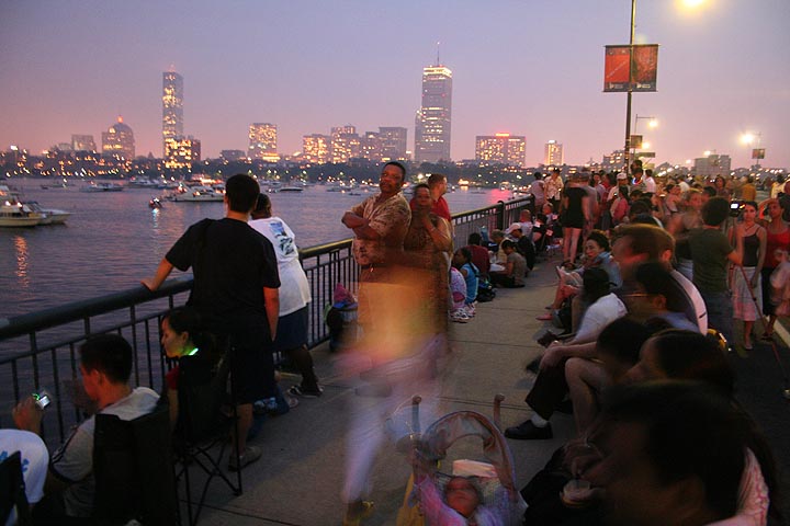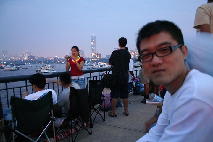 ang tao and i got off the subway at central square around 7pm, grabbed some takeout from the falafel palace (to sample some middle eastern cuisine), then walked down to the charles river, where we found a spot on the bridge so we could watch the fireworks that would begin in 3 more hours. we sat next to some other chinese folks, one of them armed with a canon rebel as well, but with an L-series sense ($$$). they had also staked out a spot near the railing, an empty tripod for a placeholder. later a noisy chinese family (bourgeois) muscled into our territory, but being that everyone involved was chinese, nobody said anything.