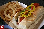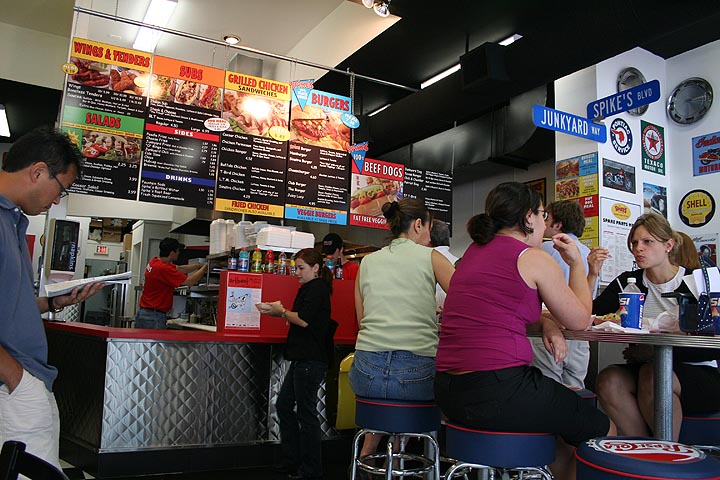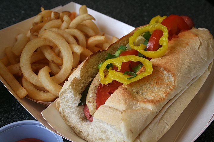 spike's junkyard dogs, famous for its hot dogs and chicken sandwiches. i was surprised to see a lot of women in the place. i had the eponymous hot dog meal, which was nothing spectacular, but it's a welcomed change from the usual fast food joints. julie went with a chicken sandwich and told me about her baxter state park adventure this past weekend.