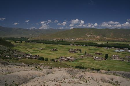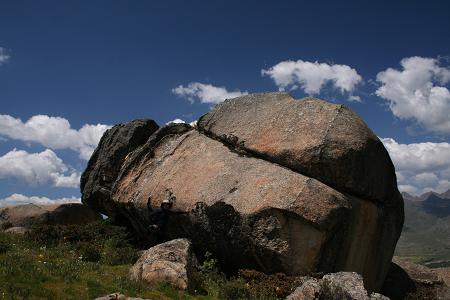 after a breakfast of snacks in my hotel room, i got dressed (putting on my contacts for the very first time, trying to get an even face tan) and started walking up the green hill of southern daocheng. from the town i could see some sort of ruins on the hilltop and was determined to see for myself. trampling through alpine wildflowers with grasshoppers jumping out of the way with each step, i ended up taking 3 hours to reach the summit, panting so fast and hard it was borderline hyperventilation. i didn't bring any food, just some white rabbit candy, which i ate voraciously. turns out the ruins were just a bunch of extremely large boulders (size of houses). i sunned myself on a large rock for a while before watching some falcons battle with a couple of ravens. it was a windy day and the falcons would sort of hang in the air, suspended, then suddenly fold their wings and swoop down like a missile. it was pretty interesting to see, like watching one of those nature documentaries. in the distance i saw some dark rain clouds approaching and decided to go back to town. it took me just an hour to get back.