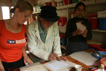 i had more fun out of the temple. i first chatted with a lady who was doing some chinese embroidery. i don't recall ever seeing someone actually doing it, so it was pretty interesting. next i went into the actual town, where it was swamped for foreign tourists who got here on bikes, as recommended by lonely planet. a lot of people were congregating in the office of doctor ho, a local chinese medicine practitioner. his entire office was covered with international publicity and claims of his magical elixirs that apparently can do things like cure cancer. i didn't want any part of that weirdness, but sat down with a session with the famous doctor anyway. he took my pulse (like a real doctor!) then prescribed some chinese medicine in the form of a powder that he said would cure my cough in a week if i drank the stuff everyday three times a day. i asked how much and he said it was free but i insisted (trying to be nice) and he said a small donation would be okay, and rather reluctantly i paid him RMB$20.