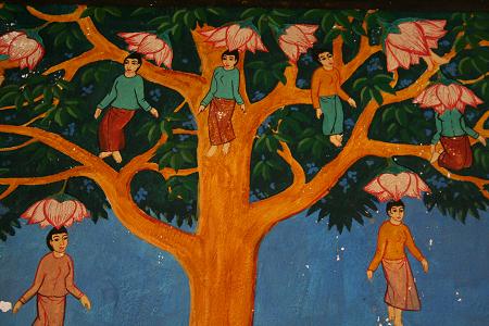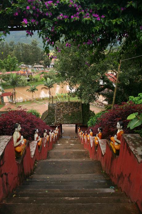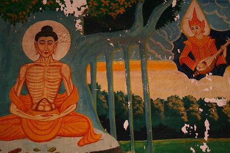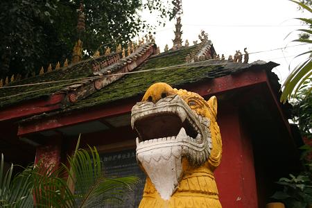 a monk waited patiently inside the main temple (not the pagoda, which was closed, guarded by a sleeping cat) as i walked around the building looking over the murals. since i can't read dai script (a cross between burmese and laos) i had fun making up my own stories.