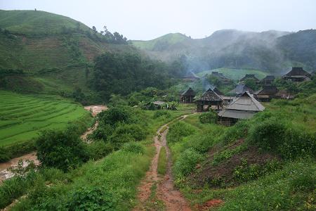 i woke up early this morning, lying in the villager's wooden hut, barely managing to get some sleep since the men were playing cards and drinking until 5am. if the noisy men didn't keep me awake, the chorus of frogs out in the rice paddies might've done the trick, everything from tiny squeaks to horrifying groans, it was definitely scary. not enough? okay, how about the fact that mosquitoes and god knows what other kind of bugs can fly through the space between the wooden floor boards and walls. i woke up covered in insect bites of all shapes and sizes. let's just say i was really happy to leave once the sun came out at 7am (no alarm clock needed, the roosters were already crowing at the crack of dawn). the 20 year old boy who invited me to stay in his home and then made sure i wasn't able to get a good night's rest opened up his eyes and said, "very tired." i didn't say anything, just gathered up my gear in the near darkness and told him i was leaving.