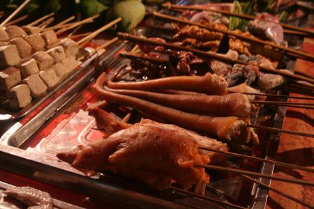 i only managed to rest a little bit before i was back outside, trying to find dinner. actually, more like breakfast, since up to that point i hadn't eaten anything yet (actually not true, i had a few pieces of beef jerky). i went to the night market where there were all sorts of street food. since i plan on being in jinghong for a few days, it was anything goes, as i ate whatever i thought might taste good. i ended up chatting with a brother-sister shiao-kao ("little roast") team from hunan; they invited me to their house tomorrow to take photos of their chickens (some of which i was unfortunately eating). afterwards i walked back to the hotel, buying some fruit and drinks along the way, and ending up at this internet cafe.