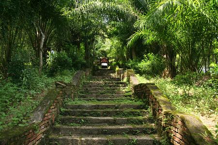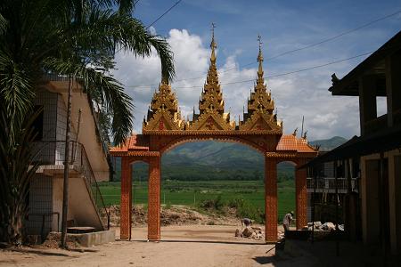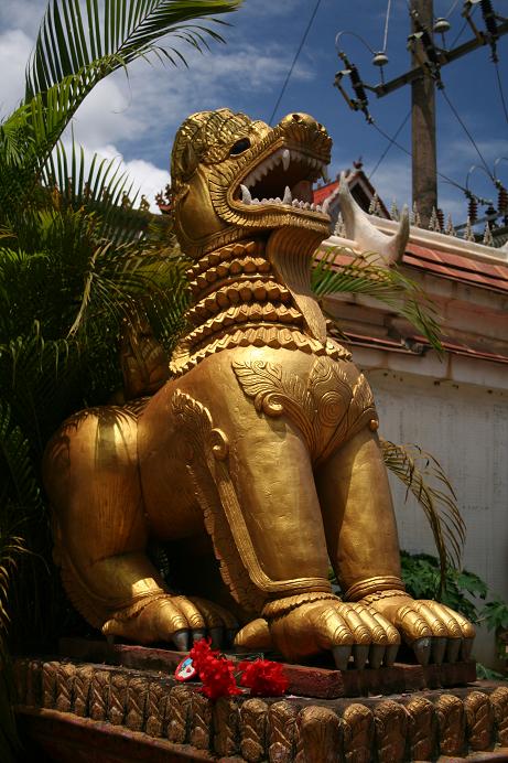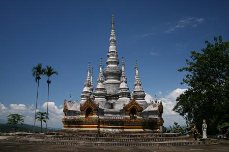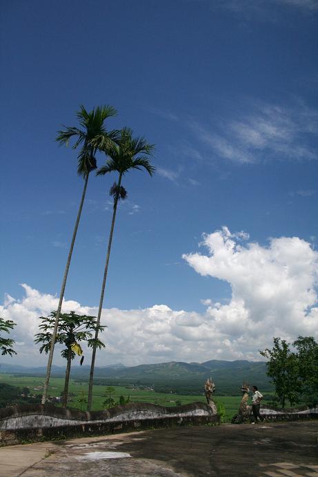 the weather when i left jinghong was cloudy but by the time i got to the damenglong area 3 hours later, it'd cleared up, with a brilliant blue sky punctuated by puffy white clouds. this made for great photo taking, as i managed to finally see the manfeilong temple. i didn't even have to pay, since whoever in charge was obviously taking an extended siesta. there was nobody else at the temple, other than a man who looked like he might be charge, but didn't flag me down to pay the admission when he saw me, instead sitting on some steps and staring off into the village down below. it was a pretty nice place, and the light breeze would occasionally sound the chimes adorning the spires of the temple.