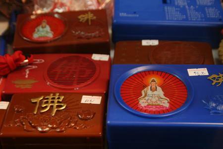 i visited a gift store before i left the temple, and asked about these tiny radios with buddhist motifs on them. just as i suspected, they're not really radios, but buddhist chant boxes, each one with a certain number of pre-recorded looping chants, for your buddha worshipping enjoyment! i bought a few, and spent an hour there chatting with the ladies who work there, who had all sorts of questions about america once they realized where i was from. a man came in (he was at the temple releasing turtles, which seems to be a very buddhist practice), overheard our conversation, and joined in the chat as well. we talked about the hotel i'm staying at, how they feel it's terribly over-priced, and told me to cut the room rate down by half or otherwise leave. the man gave me his name and number before he left and told me to call him if i ever come back to kunming and need anything. minutes later, he came back and invited me to have dinner with him and his friends. one of the ladies, who was standing behind the man, waved her hands and mouthed the word "no." i played it cool, and told the man thank you but i like to wander on my own. after he left for good, the waving lady told me that she had a suspicious feeling about him, that she's never seen him before, yet he spoke to her like they were really good friends, which they're not. they warned me that there are some bad people in china (just like monkeys, i thought), and to be careful. who knows, the man could've been legit, but better safe than sorry.