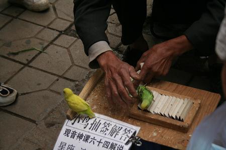 after returning to the hotel (which is just across the street from the zoo), i spent an hour at an internet cafe. along the way, i passed by the buddhist yuantong temple, with the various stores outside selling buddhist trinkets and charms and incense, and the many fortune tellers ready to read your future. i heard some girls squealing and went to investigate. these grade school girls were surrounding a man who have a pair of parakeets who apparently could see the future. the parakeets had their tail feathers clipped so they couldn't fly away. it was really interesting, he had the parakeet first bite the money the girls paid to get their fortunes read, then he'd let go the parakeet and the parakeet would go to a box and peck out a piece of folded paper, which was the fortune. one of the girls made her friend get her fortune read as well, and the two of them read it and nodded in agreement over the forecast.