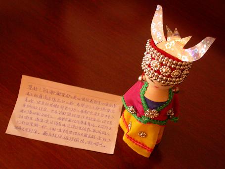 i was ahead of schedule (i didn't expect to be back until 2pm) and by the time i caught the return bus back to anshun, it was still just 12:30. i went to the market to get a bigger bag - one of these cheap tarp bags that cost RMB$5 each. i had lunch at a lamb noodle soup before returning to the guesthouse to claim my bags. turns out the new bigger bag i got was actually too small, big enough to fit just a small backpack. opening another bag - the one that has my collection of books i've accumulated during my travel - i saw a handwritten note in chinese and a doll! apparently my favorite receptionist wanted to surprise me with a present. i pretended not to see it, said good bye to everyone, and left for the bus station.