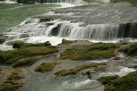 on the opposite bank of the waterfall is a massive green hill composed of what looks to be moss but its actually small bamboos.