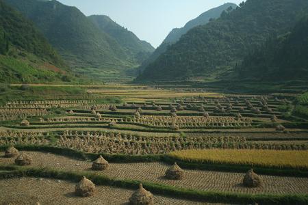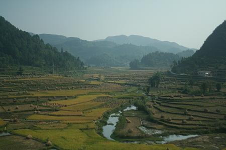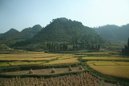 the ride to kaili took 2.5 hours, and since i haven't been getting a lot of sleep lately, i fell asleep immediately on the bus, two seats to myself, one hand on my bag in case somebody decided to try and steal it. occasionally i'd wake up and look outside the amazing scenery, rice fields everywhere in various shades of green and yellow, some already harvested, dotted with karst mountains.