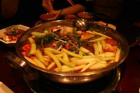 i took a taxi to the restaurant and met chris and summer. they gave me tips on how to visit the nearby villages, since they'd already done that the past two days. we had hot and sour miao hot pot with a slice of catfish.