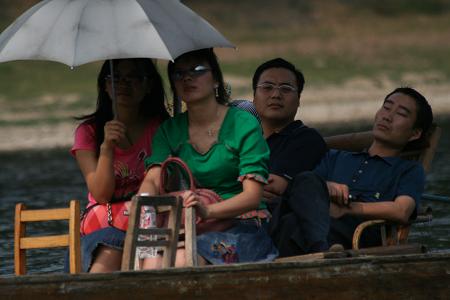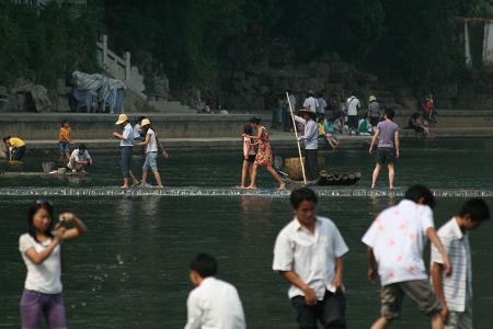 i made my way to the twin peaks cafe for some rice noodle breakfast (RMB$10) washed down with a can of sprite (RMB$10). i then visited a nearby internet cafe, before finding a place that sells those cheap plastic canvas bags (RMB$4). next i went to the bus station to buy my ticket (RMB$15) for tomorrow, and went to the xinhua bookstore to get some maps of guangxi province, materials for future trip preparations. returning to the hotel to drop off my stuff, i picked up some bubble ice tea and watched some chinese soap opera with a few hostel workers. i went back out to western street and bought a souvenir t-shirt, and walked down to the li river.
