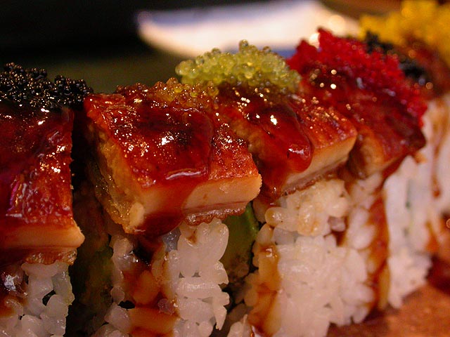 and we ruminated over the possibility that boston is heading into an economic slump as more independent shops and restaurants go out of business and the cost of working/living here gets more expensive every year (especially in light of the soon-to-be MBTA price increase). as for food, james ordered the sushi box lunch (surprisingly robust, maybe they finally learned their lesson and stopped skimping on the ingredients) while i had the godzilla maki roll. the godzilla roll is to die for and i was never quite the sushi lover until i tried it: avocado and imitation crab in the center, a layer of eel on top and sprinkled generously with multi-colored caviar. james ended up treating, which i felt a little embarassed about because i ordered the relatively more expensive meal ($17, thought i'd splurge), but i told him i'd pay the next time we lunch.
