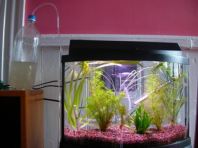 when i woke up this morning i didn't know what time it was because my cell phone was recharging on the desk. i jumped out of bed to grab the phone and saw it was 11am. i noticed the weather change right away because it was cold in the house. going into the bathroom, i was happy to see that the heat was kicking in, which meant the furnace in the basement didn't go out during the past week of unseasonably warm temperature. i got dressed and went out. it was cold but i wasn't going far, just to the brighton petco to buy some suction pads. i came home and worked on my carbon dioxide project. an inverted half of a plastic water bottle served as my gas collector. there still isn't enough carbon dioxide being produced in the soda bottle to start trickling gas into the aquarium though. there could be two reasons: i could have a leak in my setup (which i doubt, because it is sucking in water, just the opposite of what i want, but proof that its a closed system) or there's something not right with my yeast mixture. maybe it works better if it's heated. if it still doesn't work by tomorrow i might have to try something else. in the meantime the plants seem to be hanging in there, but i feel like they're not really growing because they lack carbon dioxide.