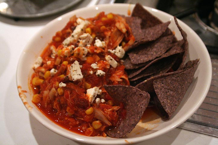 julie made some spicy mexican chicken dip served with corn chips. it took her about 15-20 minutes to make the meal and we were far ahead of schedule so we managed to watch the latest episode of america's next top model from start to finish. i was rooting for one of the twins to get booted off the show and tonight it finally happened. i don't think either of them were attractive (they're identical twins: if one's ugly, the other one's pretty much the same). i like melrose's sense of humor and positive attitude, but i don't think she's prettier than caridee, even though ms.dakota totally pooped in the pool when she bad-mouthed nigel, guest photography/judge. eugena's a wild card, but i think this cycle will go to a white girl. the rest of the evening was spent watching the food network.