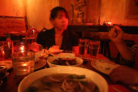 it took me 30 minutes to get from malden to cambridge, where i met my parents at the cafe closing the store, along with my sister. my parents were treating my sister to dinner so she could have her pick. this is the difference between my sister and i: she decides to go to a fancy restaurant, while if it was me i'd pick some place cheap. we went to the pho republique in the south end, a high end vietnamese slash thai fusion restaurant. we clearly didn't belong there, and both my father and i were dressed in jeans, and we were the only asian party eating there. i wanted to run when i saw the prices on the menu: a bowl of pho was $16, about 4x more expensive than what i usually pay for pho. since it was sister's birthday however, i gritted my teeth and played nice. if nothing else, the pho republique is probably one of the prettiest asian restaurants i've been to in the boston area. the pho wasn't anything nice, a lukewarm broth with thick overcooked slices of brisket, and no fan favorites like tripe or tendon (maybe the cultural elites that frequent these places don't look fondly to snacking on the lining of a cow's stomach). the appetizers were far better however, and one in particular, sort of like a big crispy rangoon but with cuts of salmon on the inside like a jumbo sushi. by the time we left i think my sister was thoroughly embarassed by us and hussled quickly back to the car on this windy and cold night. we arrived back at the cafe where i borrowed the car once more, returning to dan's place for more movie marathon moments.