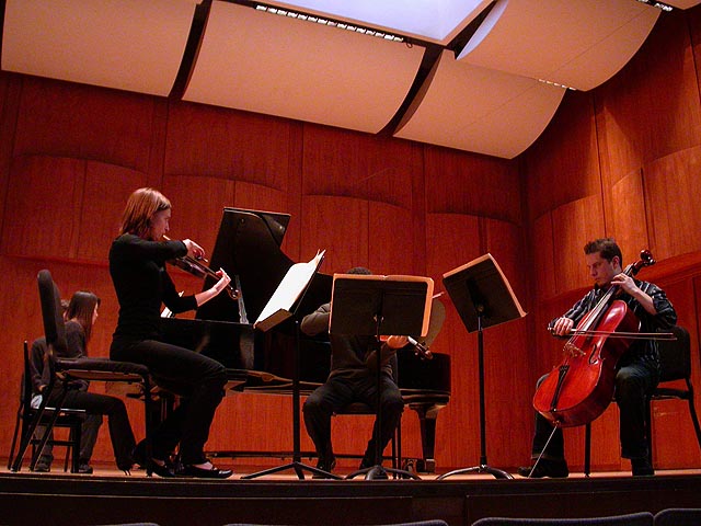 when i got to the school i called alisa to ask where she was; she was still at home and probably couldn't make it. this left me in an awkward position, attending a performance where i didn't really know anybody, but since i had nothing to do anyway, i figured at least it'd be a good way to kill some time. the turnout was low (a dozen people at most in a large auditorium) and the only other person who i even remotely recognized was kenny, one of alisa's roommates who gave me a ride home a few nights ago. he wasn't much of a talker and i found myself engaging in small talk in order to not make things weird. learning from my mistake at the last performance (where i sat near the back, so i couldn't get any photos), we sat in the front row, while everybody else sat all the way in the back. we were so close to the stage we could practically touch the musicians.