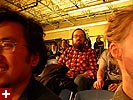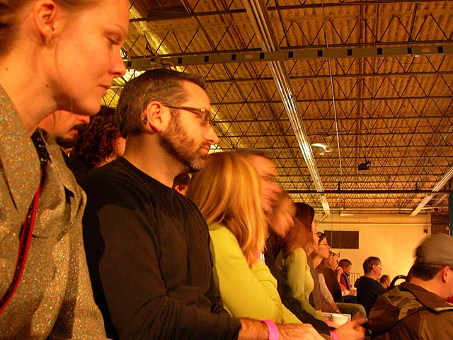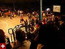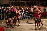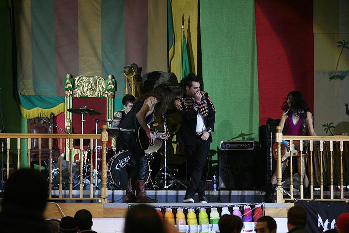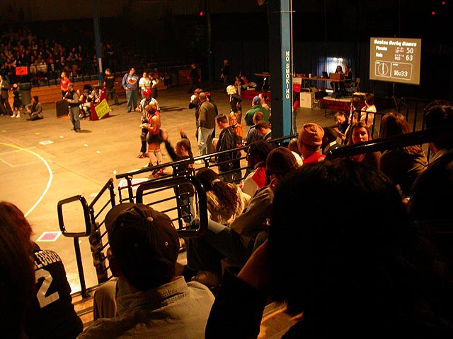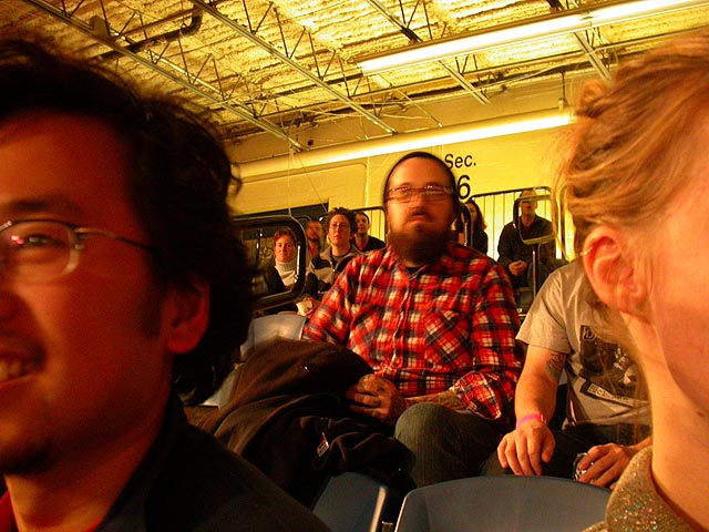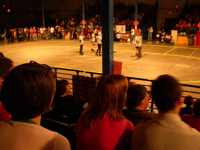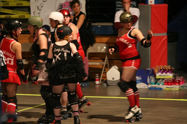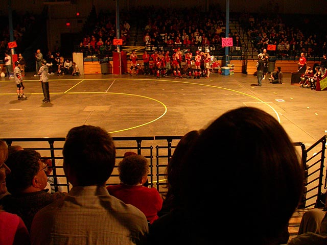 the derby was punctuated by two intermissions, giving people a chance to stretch their legs and wander to the concession stand to buy beer in a plastic cup. up on stage, an 80's cover band played to the crowd. one of the guitar players looked like my freshman college roommate and i wanted to call out his name to see if he'd respond ("gene! you still owe me that physics book!").