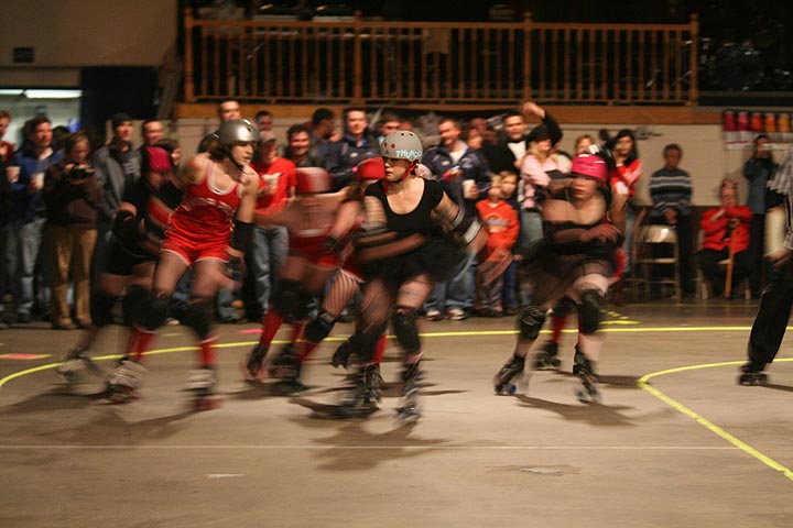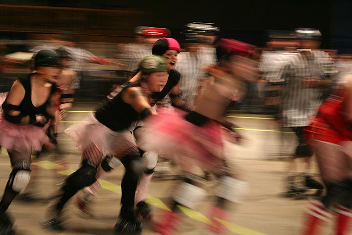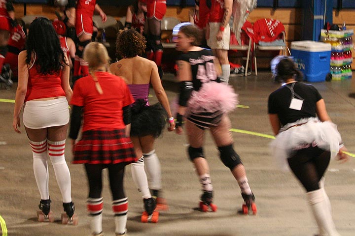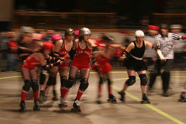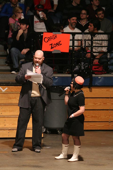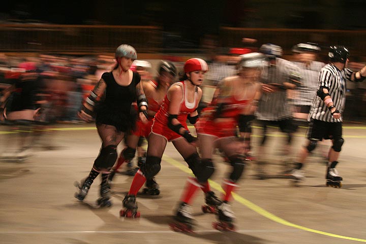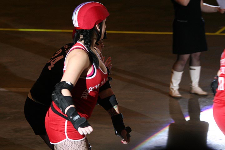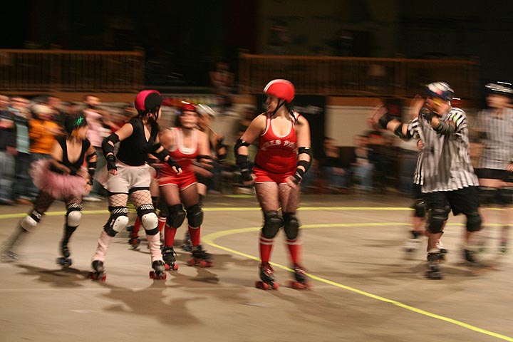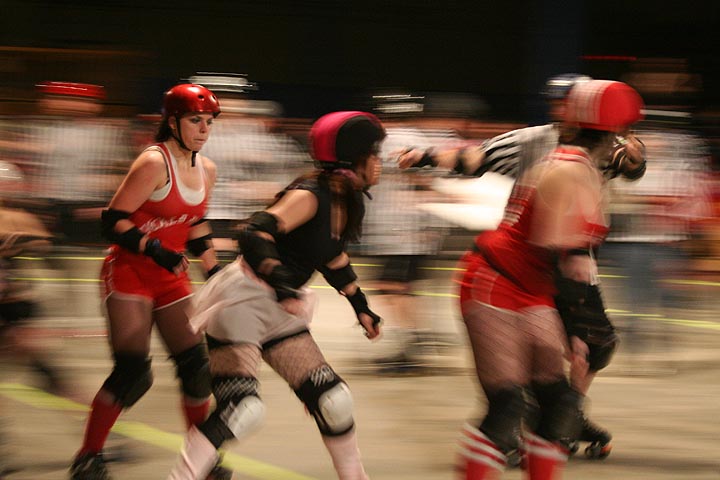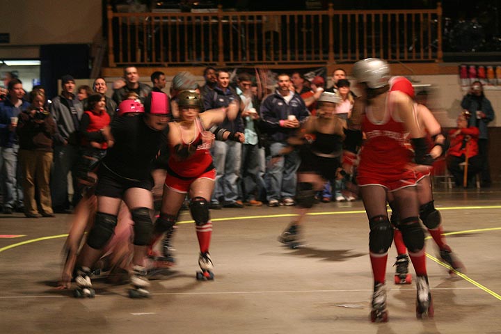 my day started with some channel surfing, where i came across a spanish-language variety show pitting two latinas with ample décolletage in a game of televised jenga. that pretty much set the mood for the rest of my day. eliza's coworker friend carl came to pick me around 5pm, his girlfriend hilary in the driver side seat and eliza in the back. we were on our way to wilmington, to the shriner's auditorium, to see a roller derby for the very first time. they've been around since the 30's, but the recent resurgence has taken an ironic altpunk-hipster theme, with all-female teams taking on names like wicked pissahs and the nutcrackers, and sporting punny handles like pina collidah or amandaconda.
