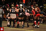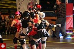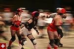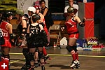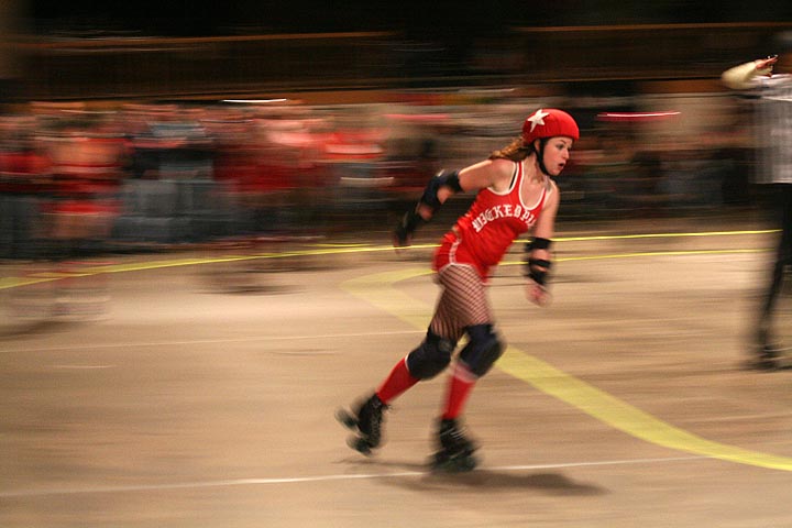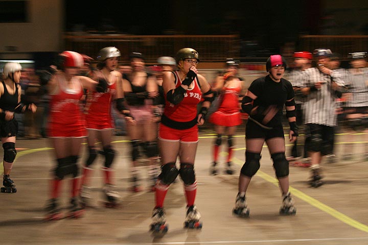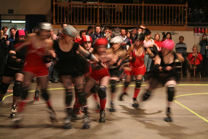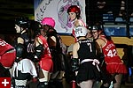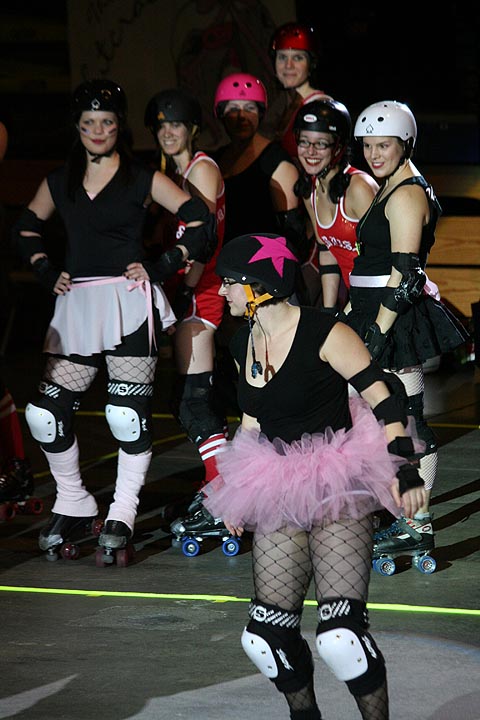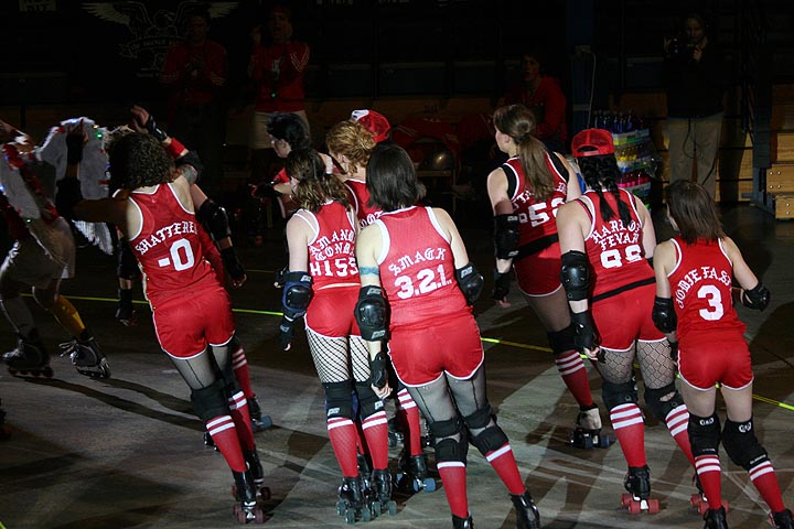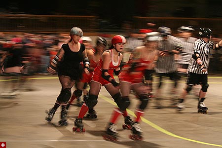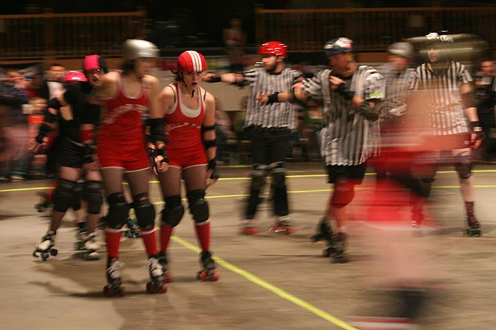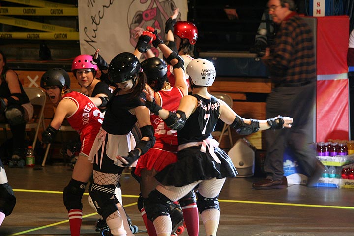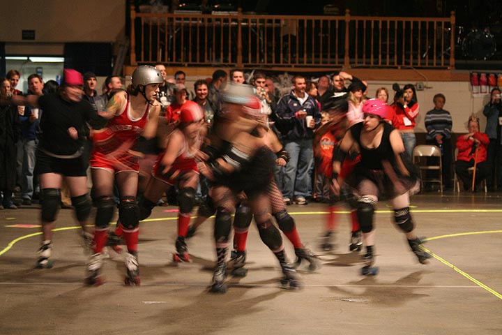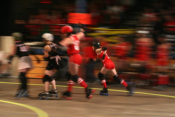 my day started with some channel surfing, where i came across a spanish-language variety show pitting two latinas with ample décolletage in a game of televised jenga. that pretty much set the mood for the rest of my day. eliza's coworker friend carl came to pick me around 5pm, his girlfriend hilary in the driver side seat and eliza in the back. we were on our way to wilmington, to the shriner's auditorium, to see a roller derby for the very first time. they've been around since the 30's, but the recent resurgence has taken an ironic altpunk-hipster theme, with all-female teams taking on names like wicked pissahs and the nutcrackers, and sporting punny handles like pina collidah or amandaconda.