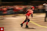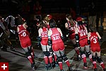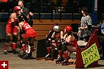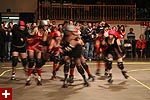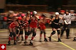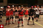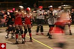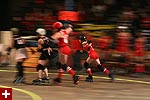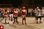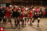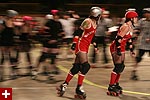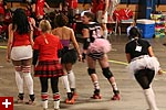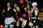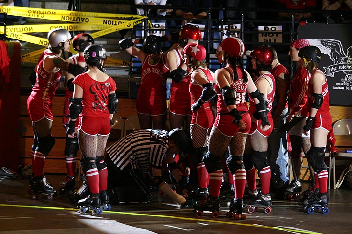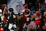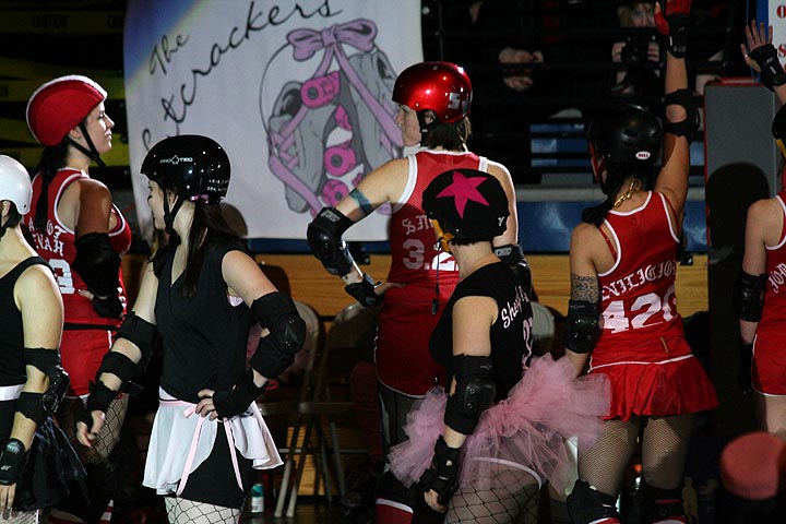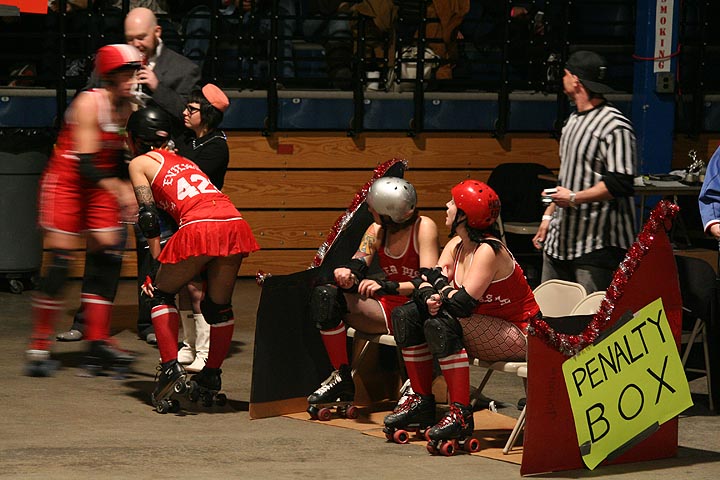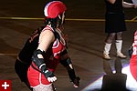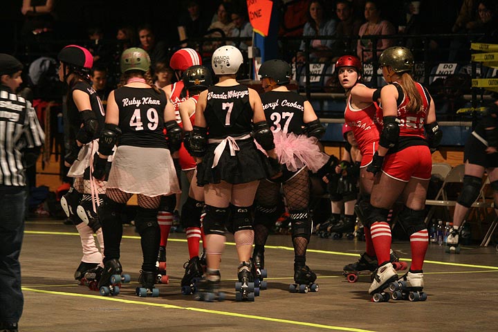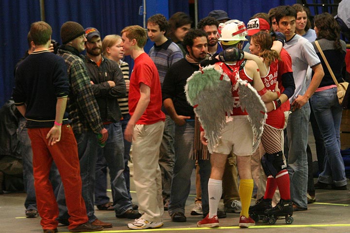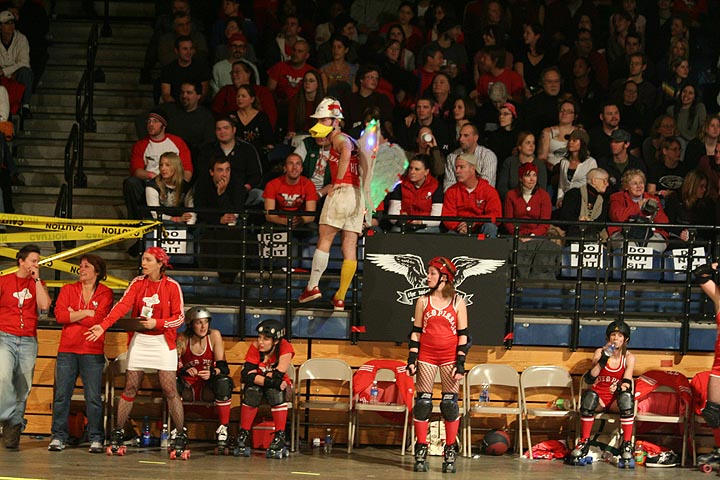 i was rooting for the wicked pissahs over the nutcrackers purely for superficial reasons: their girls had the cuter outfits and just looked better. the type of ladies ran the gamut, from scrawny petite-sized girls (they're usually the faster skaters), to scary butchy girls, to big girls straight out of some robert crumb comix. the pissahs even had a team mascot, a boy dressed up in a duck outfit who would periodically incite the crowd to cheer loudly for the team.