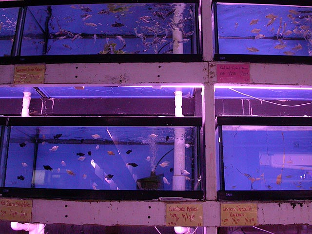 it's hard to imagine what goes on inside judging from the building's outward appearance. only the entrance with its kitschy sign hints at things to come. the thing i noticed right away is the amount of security: iron fenced doors and 16-camera security system. but if my aquarium was located in the middle of nowhere, i'd probably want some theft protection as well. the front of the store was all equipment, tanks of all sizes, filtration systems, pumps, decorations, gravels, testers, fish food.