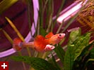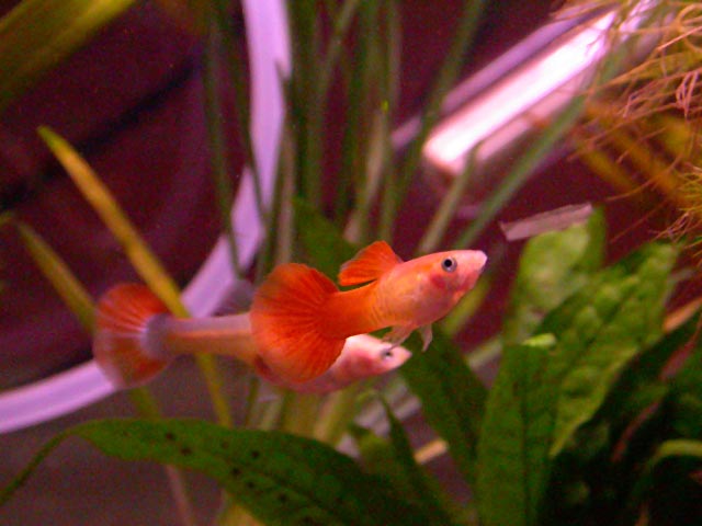 preferring to stick together, but would occasionally disband. although the shape of their upward-turned mouths would suggest surface feeders, i saw the guppies scouring the gravel looking for food, and even saw one eating a large piece of dead plant. one of the females seemed particularly large, either from overfeeding (which i doubt) or possibly pregnancy. if she does give birth (guppies are livebearing), the fries will either be sucked into the filtration inflow or eaten by the other fish, so it's not really something i'm looking forward to.
