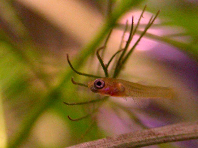 while feeding the fish this morning i noticed something new in the tank: a tiny baby fish! apparently that one bloated female was in fact pregnant and delivered during the night. i found her swimming around, back to her formerly slender figure. i looked around the aquarium and saw another fry, then another. i counted a total of 10 fries, no longer than half a centimeter each, most of them hiding in the plants. i was happy to see the baby fish but i knew things wouldn't go well for them.