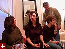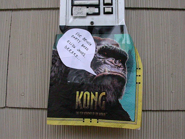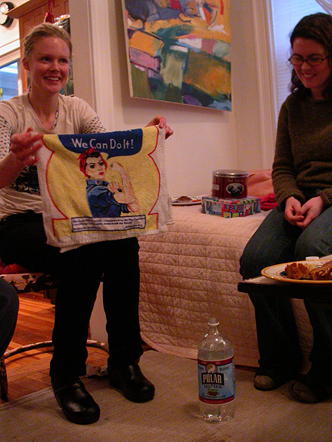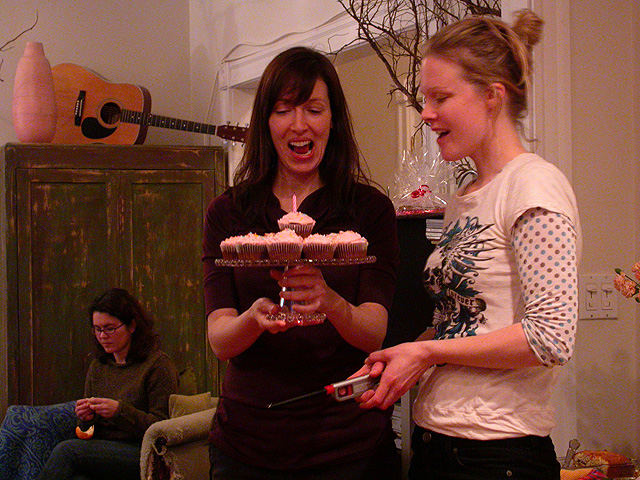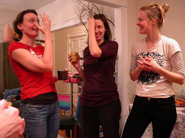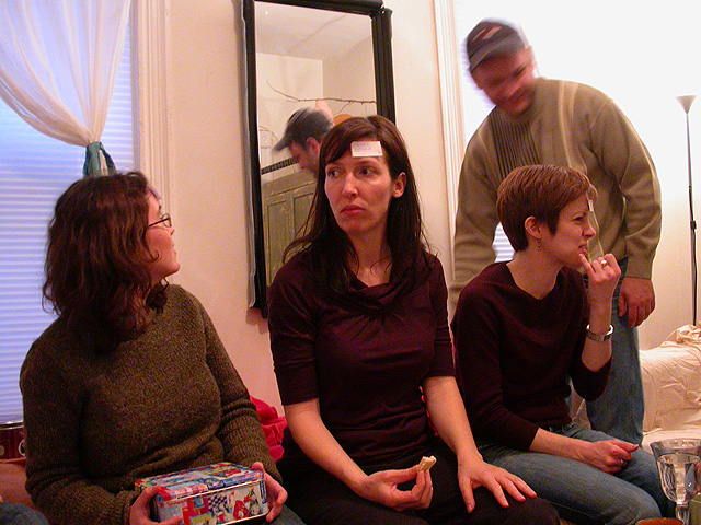 in the afternoon we played a game of "guess the name of the important person taped to my forehead." jerica was the first to win with marie antoinette, followed by rachel with princess diana. i had big bird which took a while for me to finally figure out. the one i wrote for erin was james brown "sex machine" which she finally got after we steered her away from dead rap stars. eliza had chip kidd, whom most of the partygoers didn't know who he was (including me). tara had one of the toughest ones, "eliza jones," and was asking some unintentionally funny questions such as, "does my person have a sidekick?" or "would people pay to see her online?"