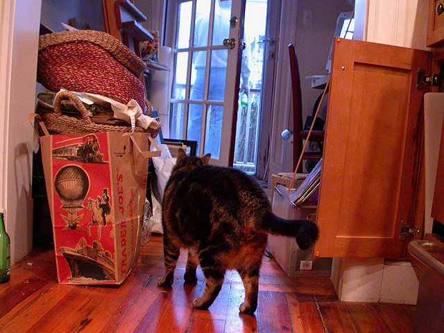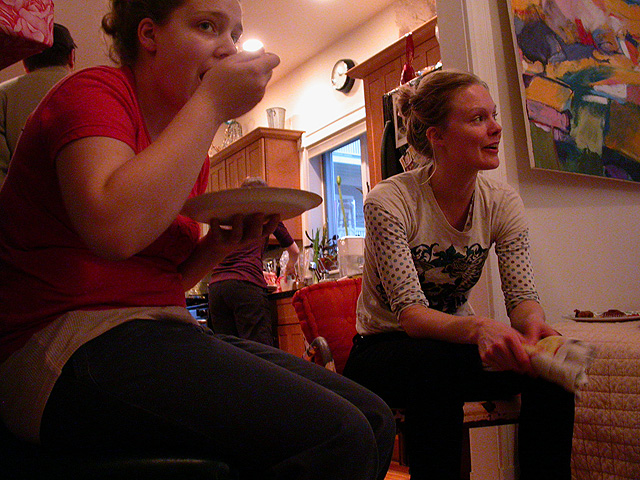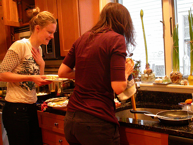 jerica and rachel were already at eliza's place by the time i got there close to noontime (wearing near matching maroon tops, as if they planned it that way). we passed around some just-cooked eggs and potatoes while waiting for more people to arrive. eliza showed me the two kittens in her new housemate's bedroom, kept there so her cat won't attack them. the food disposal in the kitchen sink was clogged so jerica and i fixed it with a bathroom plunger (there was some debate as to whether or not this was a kosher thing to do). some other people i knew showed up as well: shauna, erin, jaeda, and jesse (whom i haven't seen since february). i met andrea who also went on a long china trip of her own 2 years ago. eliza's brother and fiance showed up briefly, as well as some of eliza's neighbors.