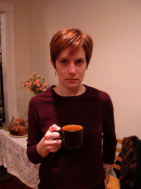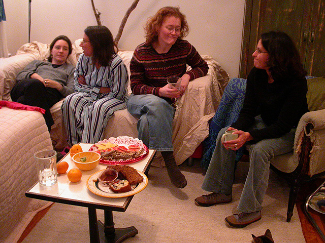 it was raining this morning and i almost wanted to cancel on eliza's new year's day birthday brunch, but the thought of the copious amount of food waiting for me in jamaica plain was an irresistible reason to finally get out of bed. this is the third new year's brunch i've been to, each one at a different place (2004, 2005). i got dressed and went out into the freezing rain with my umbrella and my gift of 2 cantaloupes.