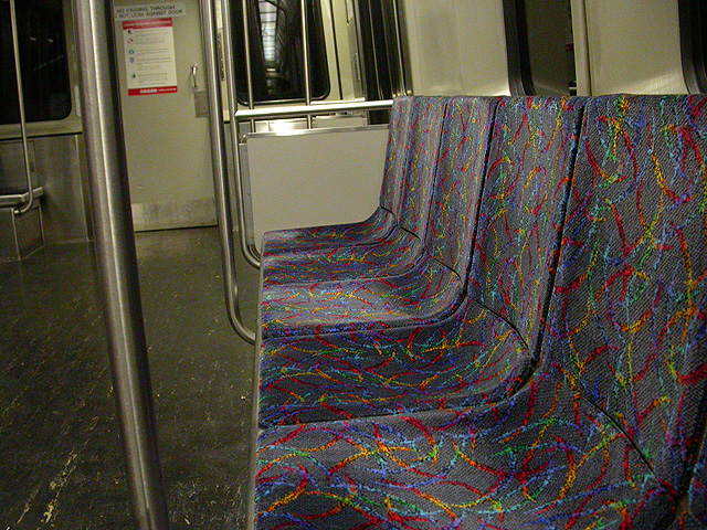 took the T this morning to alewife to discuss a january project with client S. i realized this last night but it would've been cheaper for me to borrow my parents' car and drive over there instead. on the subway i saw MBTA money being well spent: newly upholstered garishly-patterned rainbow seats on the red line! i personally prefer fabric over plastic but wouldn't it be cheaper (and easier to clean) to have PVC seats instead? maybe they thought sitting on some color might make riders forget the 75¢ fare increase.